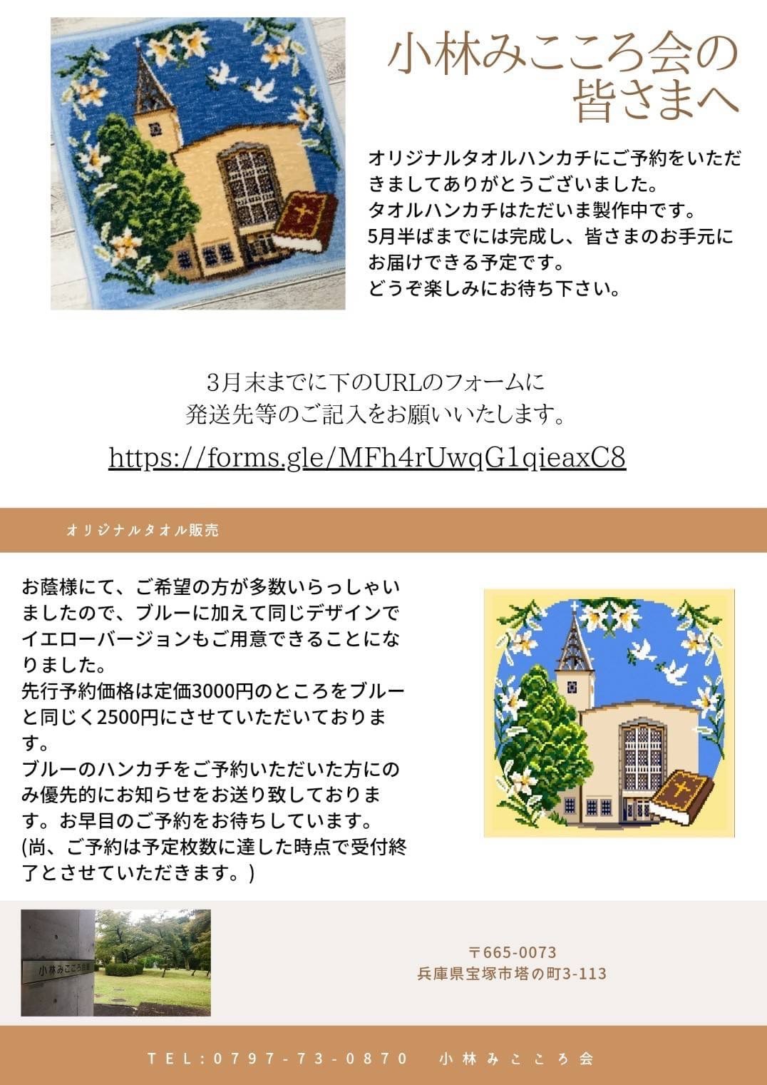 この度は小林みこころ会オリジナルタオルハンカチにご予約をいただきましてありがとうございました。