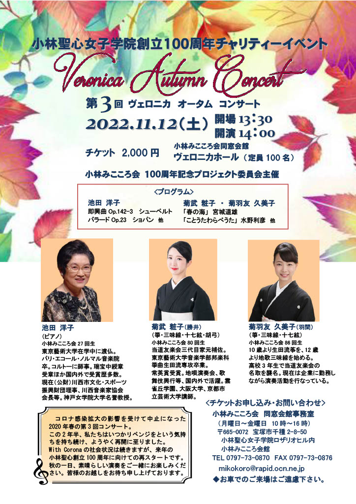 2022年9月9日 / 最終更新日時 : 2025年10月29日 小林 みこころ会 行事等のご案内 オータムコンサートのご案内 日頃より、同窓会の活動にご協力をいただき、ありがとうございます。 このたび、小林聖心女子学院創立100周年記念行事の一環として オータムコンサートを下記の要領で開催いたします。 皆様にもぜひご来聴いただきたく、ご案内申し上げます。 小林みこころ会100周年記念プロジェクト委員会