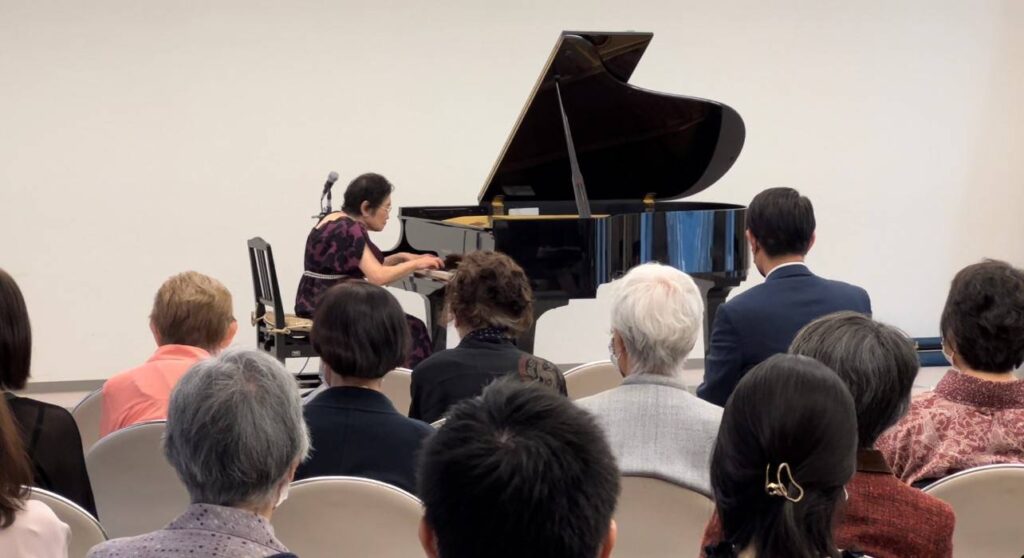 池田洋子さん(27回生)のピアノ演奏、菊武粧子さん(80回生)と菊羽友久美子さん(86回生)の