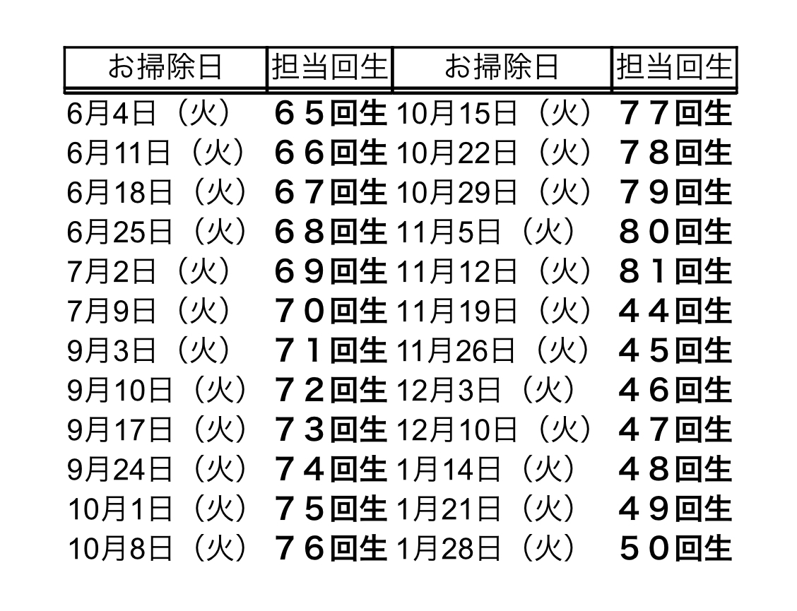 2020年1月末までの会館掃除について、各学年のお掃除分担のスケジュールは下記の通りとなります。
