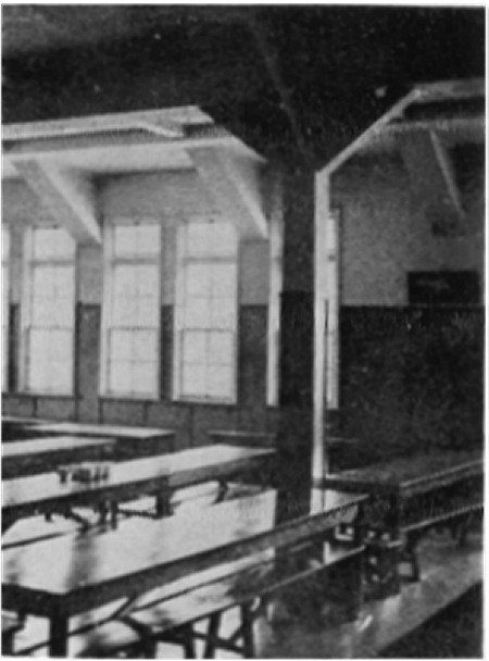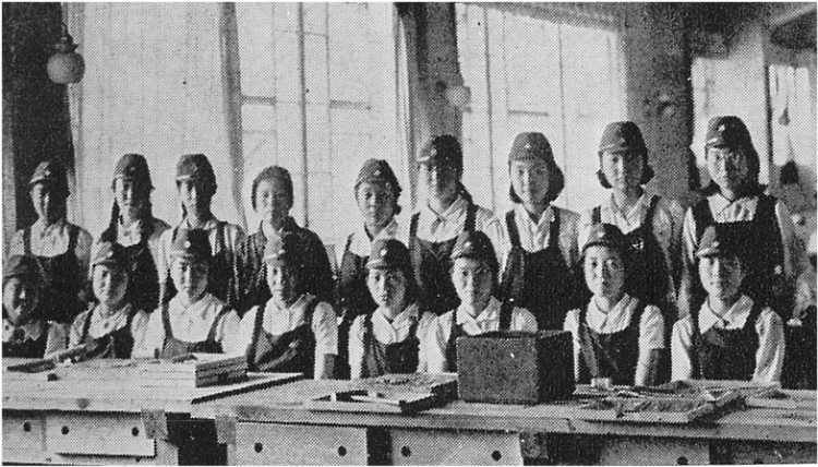 現在の図書室、寄宿舎食堂、講堂、校長室、事務室が陸軍の飛行機部品を製作する川西工場、一方、2階、3階の旧寝室が海軍の製図工場にあてられ、女学校の生徒は終日写図・成形・組立の作業に動員された。