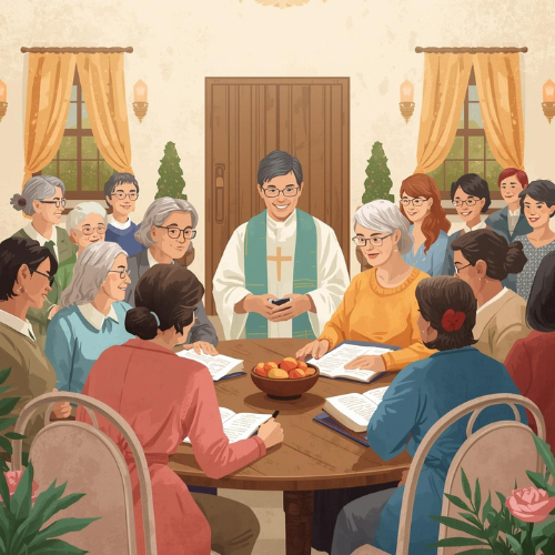 毎月第二木曜日に矢野吉久神父様(箕面教会)の講話があります。教会などではなかなか知ることのできないお話も伺えて納得させられることが多々あります。毎回幅広い分野の書物紹介があり、それも楽しみの一つです。出欠は自由です。ご多忙な方も是非一度ご出席くださいませ。
